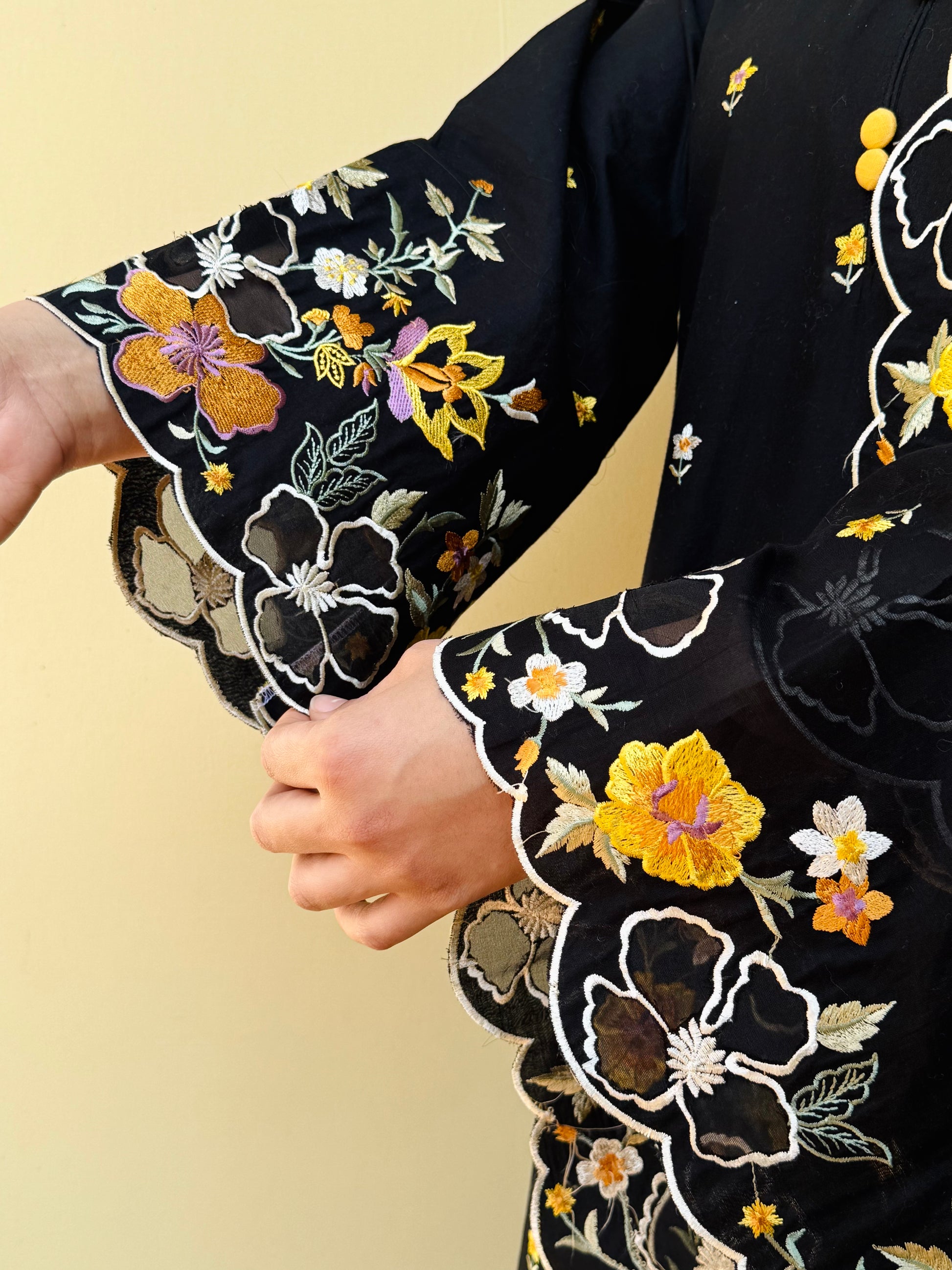 Three-piece pure cotton goodness with heavy embroidery - top, bottom, and dupatta.